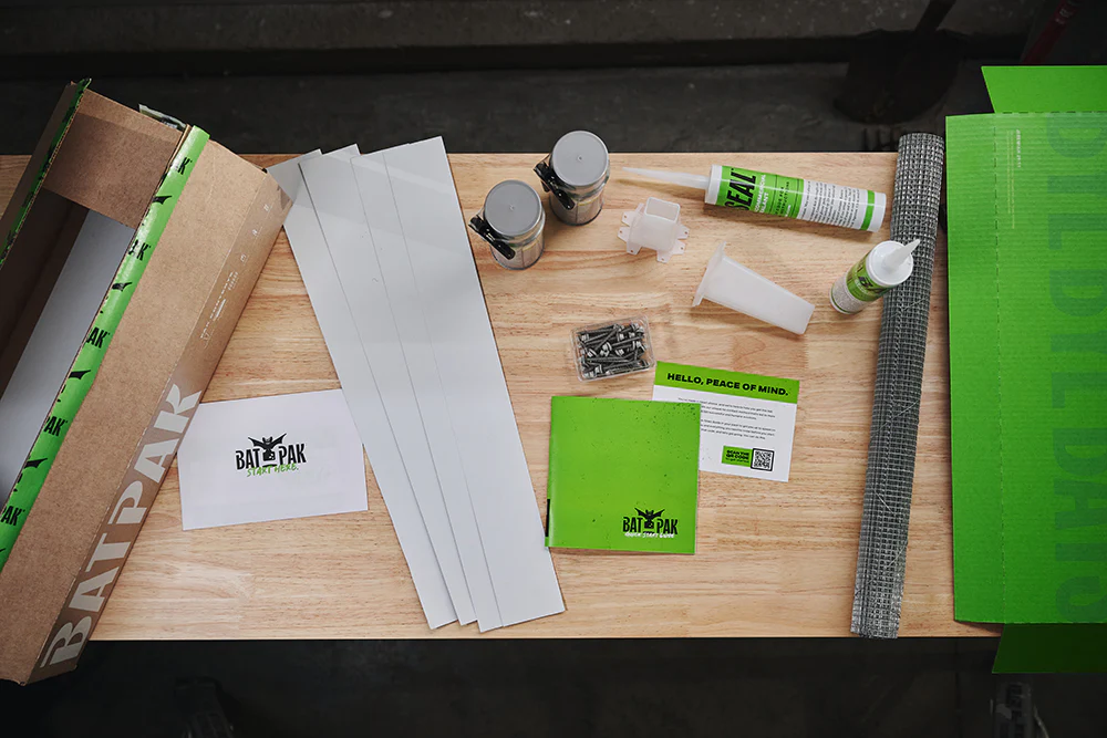 The BatPak™ kit is a complete bat-eviction system. It comes standard with everything you need to ensure bats are evicted from your home humanely and at a fraction of the cost of calling a professional. This includes our patented, made-in-the-USA Bat Slide®, our BatSeal® sealant, closed-cell expanding foam, hardware fabric, color-match metal flashing, plus all the hardware to seal every opening to ensure bats have no choice but to get out and stay out.